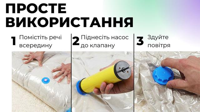 Вакуумні мішки дуже прості у використанні. Помістіть все необхідне всередину, піднесіть насос до клапану і здміть. Розмір мішка відразу зменшитися, і це дозволить вам зберегти вільний простір для інших речей. Мішки багаторазові і прослужать вам довгі роки.